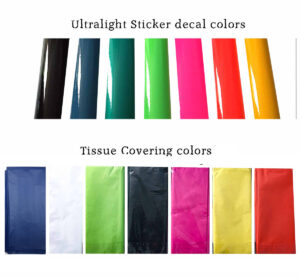 You will receiver one color of each sticker decals and tissue. Tissue will be used to cover the bottom of the wings, while ultralight sticker decal will be used for the top center of the wings. Email me if you desire your own color combinations.